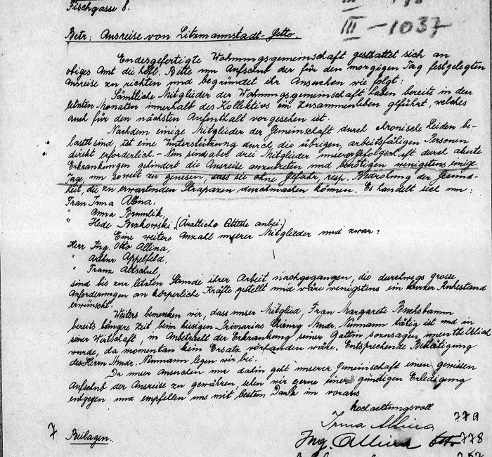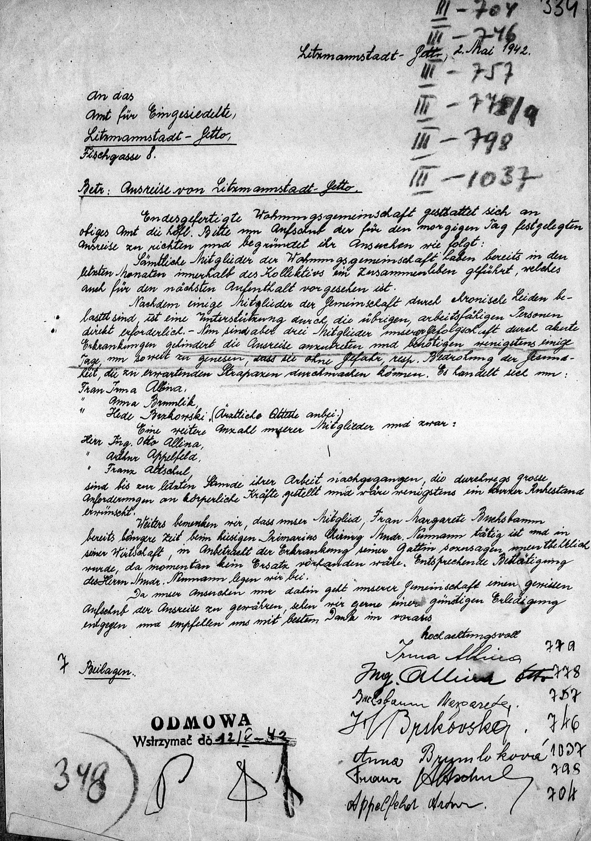 Half of the Czech ghetto Jews died that winter, which was particularly harsh. Researchers know that Anna and Eva survived the winter, because a letter dated 2 May 1942 asked the Łódź Ghetto resettlement commitee for a temporary exemption from a planned deportation the next day. Anna Brumlíková’s name was one of the seven signatures on the letter. The reason for seeking the exemption, according to the letter, was that Anna was “acutely ill.“ The request was denied. According to The Chronicle of the Łódź Ghetto (vide) , on May 3 the people were to gather at the Central Prison (vide). They were deported to Chełmno (vide) the following day. Anna and Eva were on the transport list, and it appears they died on that same day.