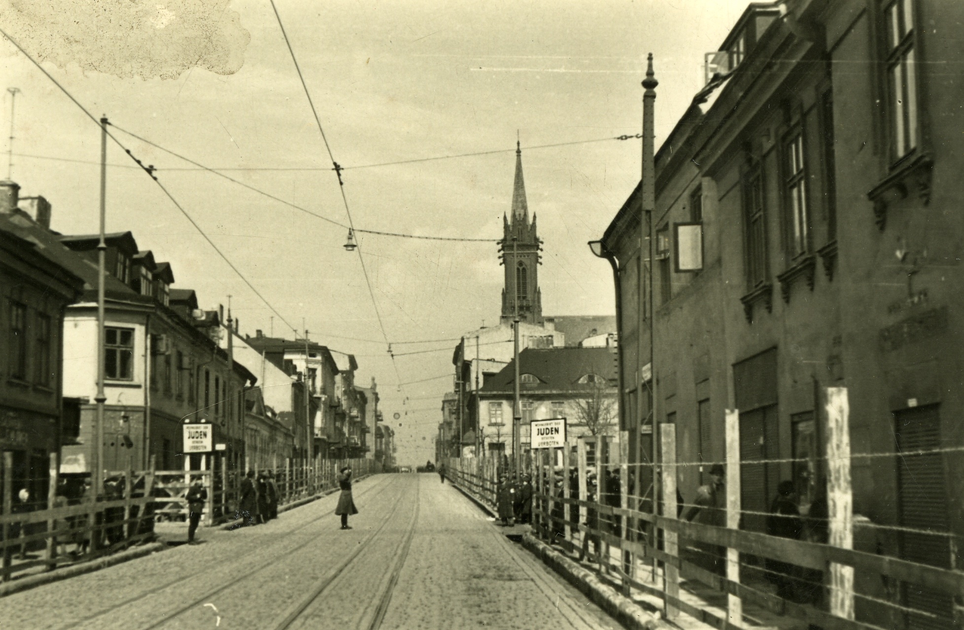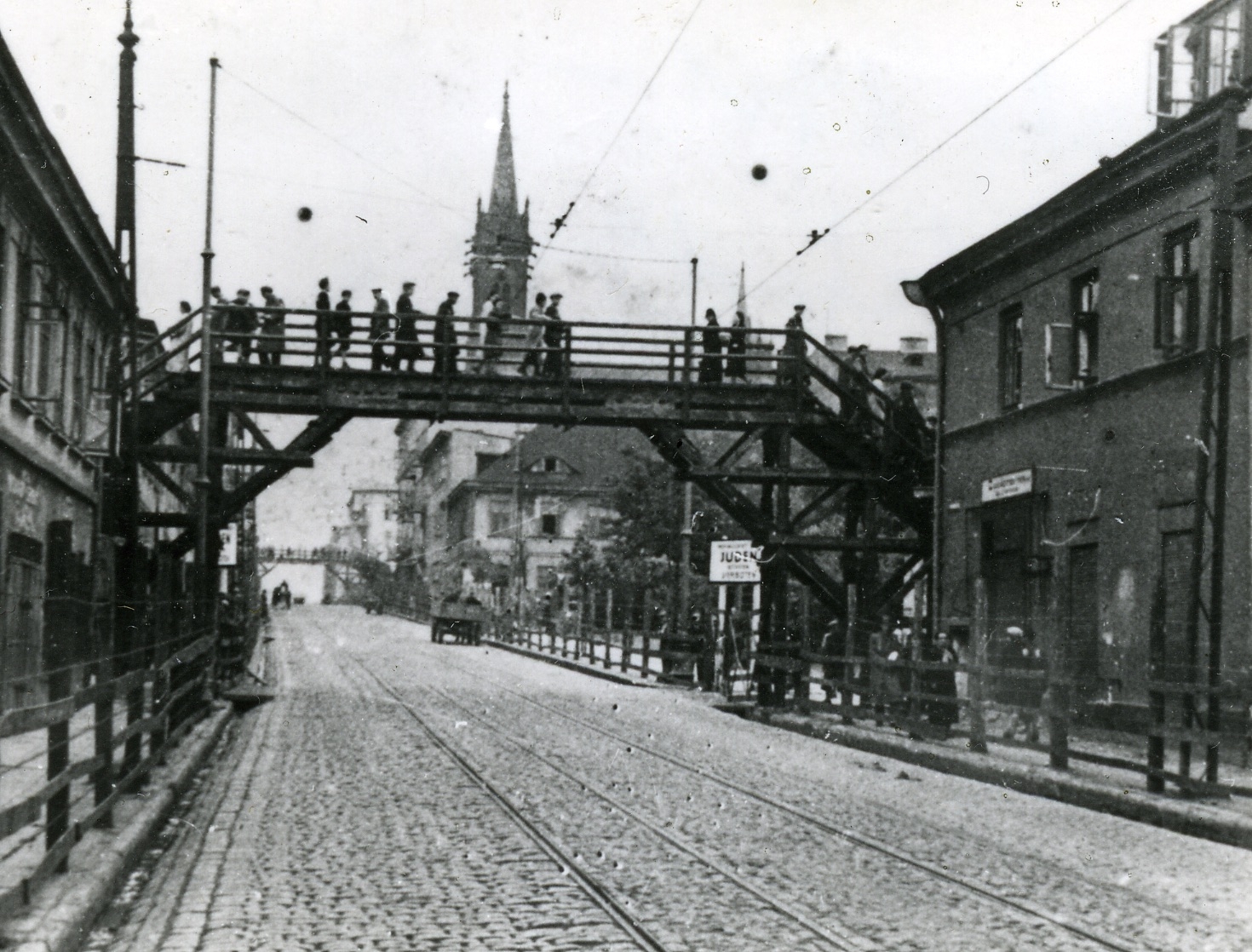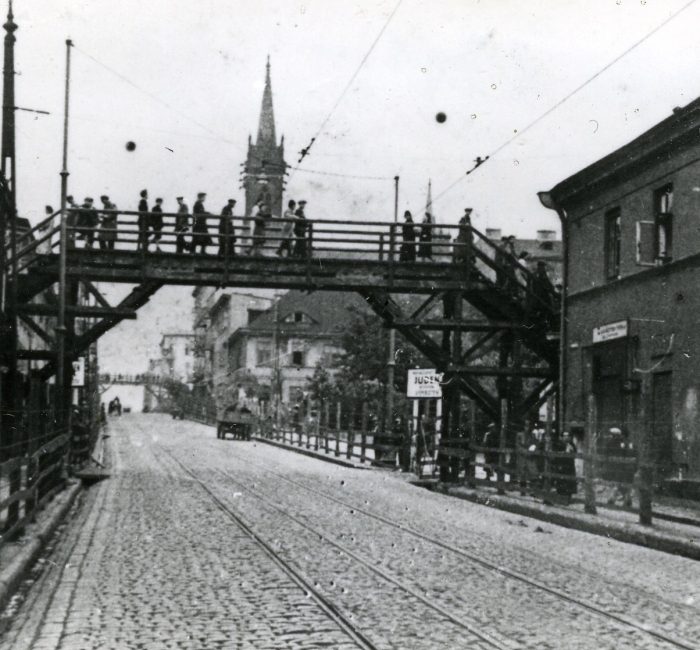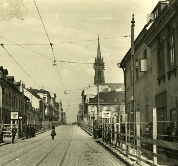 As Zgierska and Limanowskiego streets – important thoroughfares for vehicular traffic in the city which held the only streetcar connection between the center and northern districts – could not be wired when the ghetto was fenced off, wires were installed along these streets as well as around the entire ghetto, separating the roadways from pavements and allowing transit through the ghetto – thus dividing it into three separate districts connected by bridges and gates (vide [Mosty] and [Tor]).