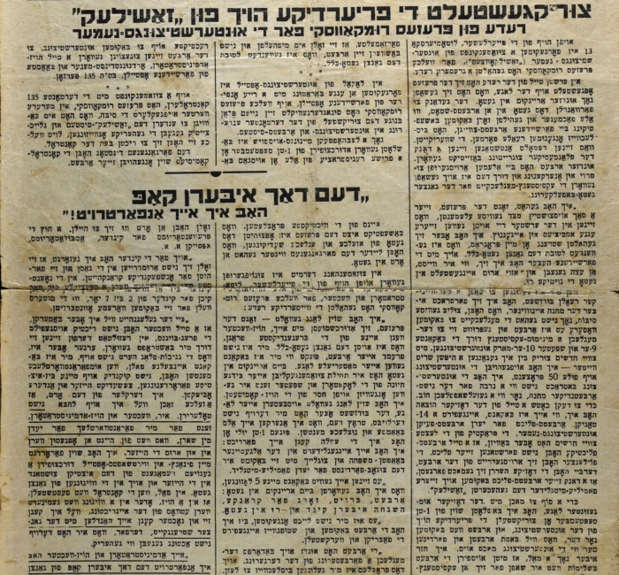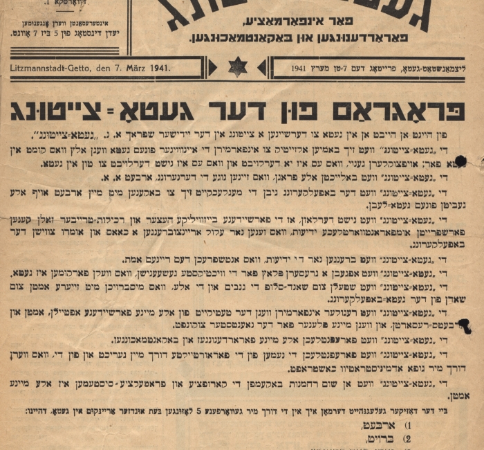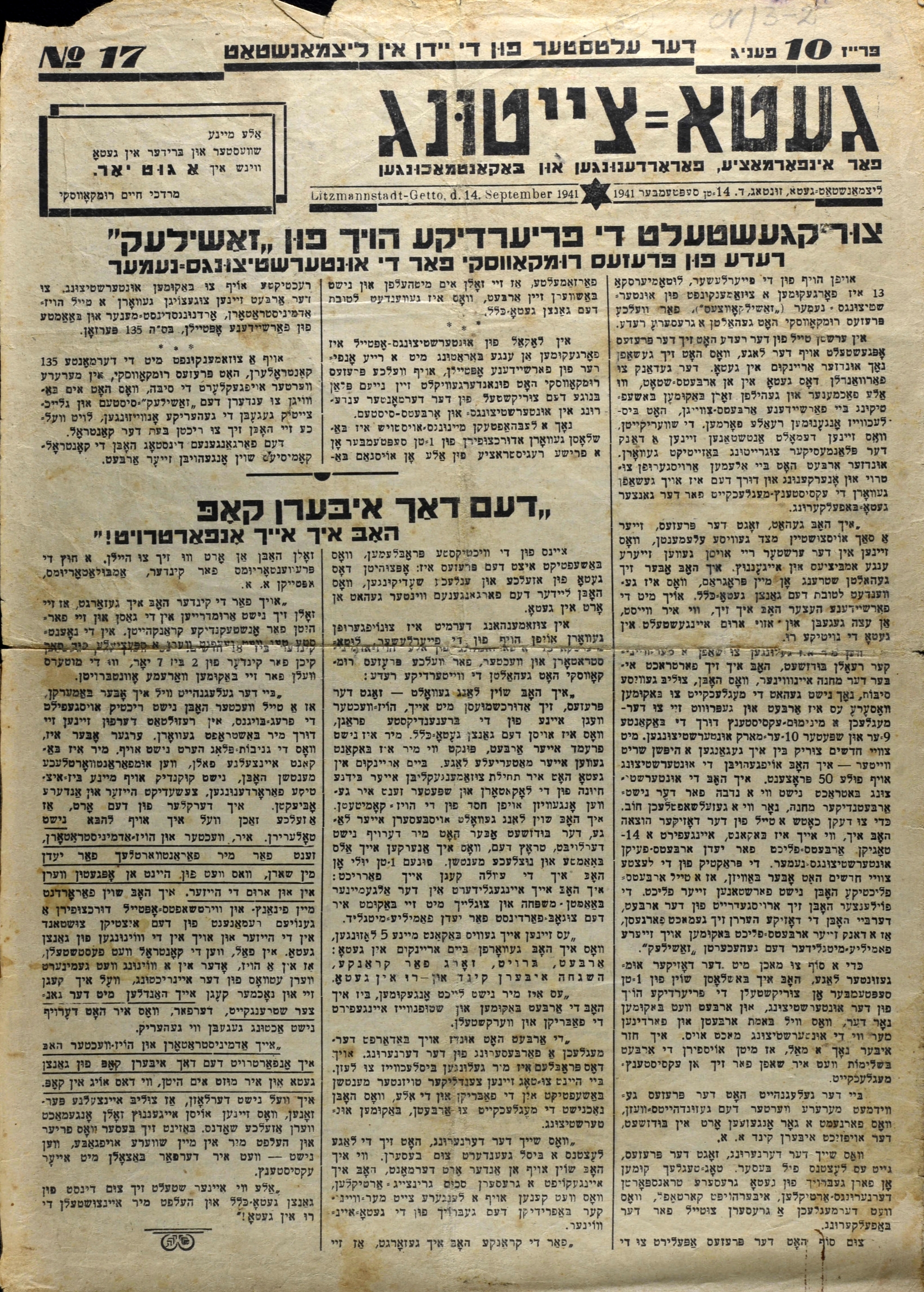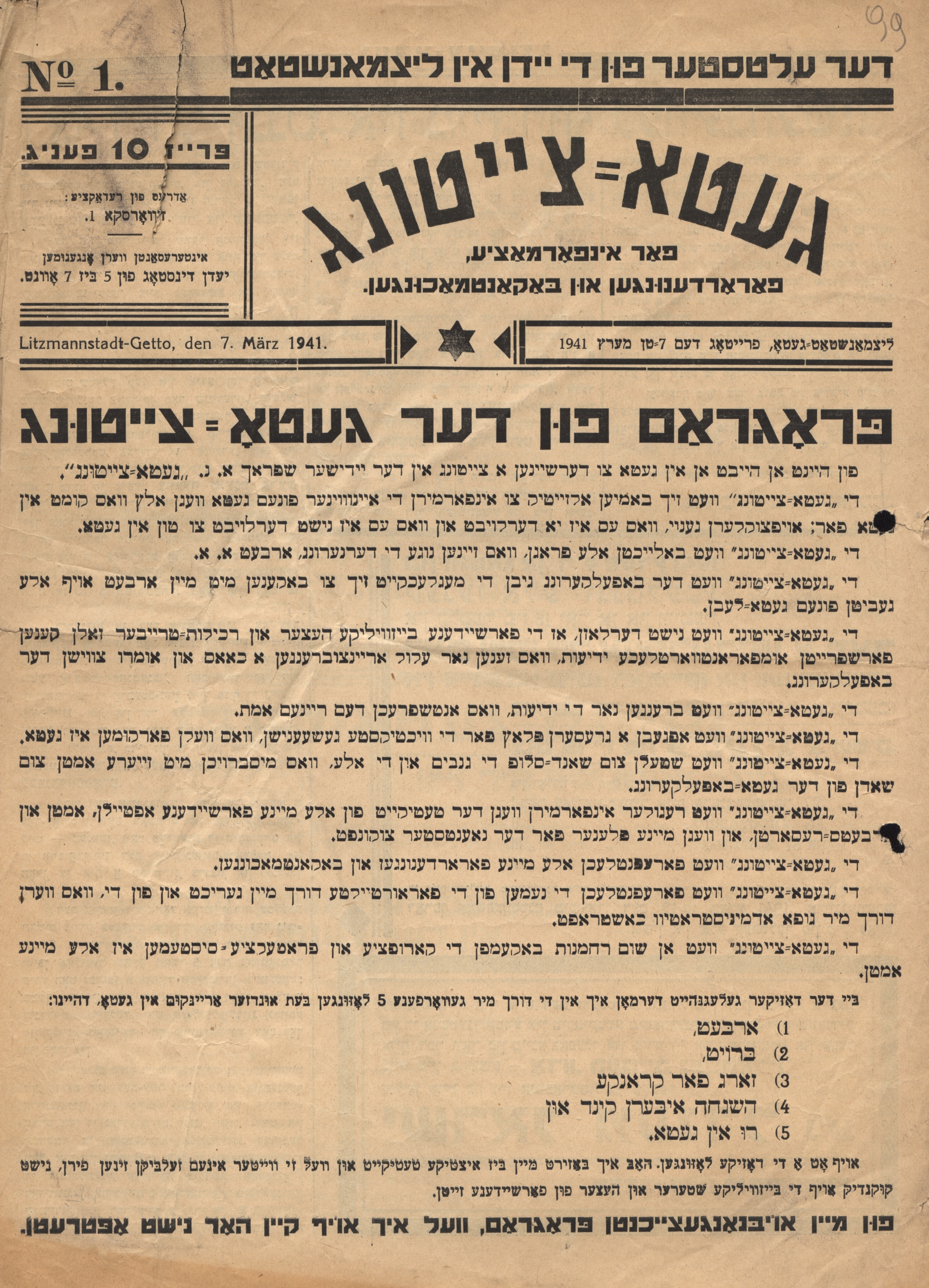 „Od dzisiaj zaczyna się w getcie ukazywać gazeta w języku żydowskim pt. «Geto-Cajtung». «Geto-Cajtung» będzie starała się wszechstronnie informować mieszkańców getta o wszystkim, co się w nim dzieje; dokładnie wyjaśniać, co wolno robić w getcie, a czego nie.