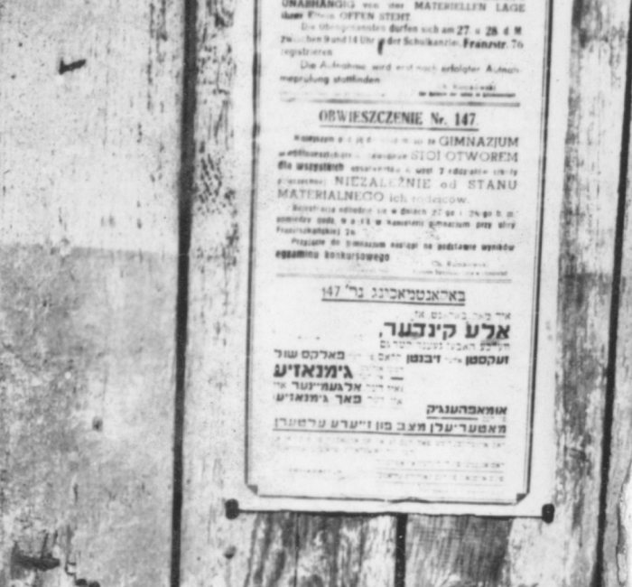 Jedno z obwieszczeń (vide) Przełożonego Starszeństwa Żydów (vide) opublikowane 23 października 1940 r., dotyczące rejestracji uczniów do gimnazjów (vide).