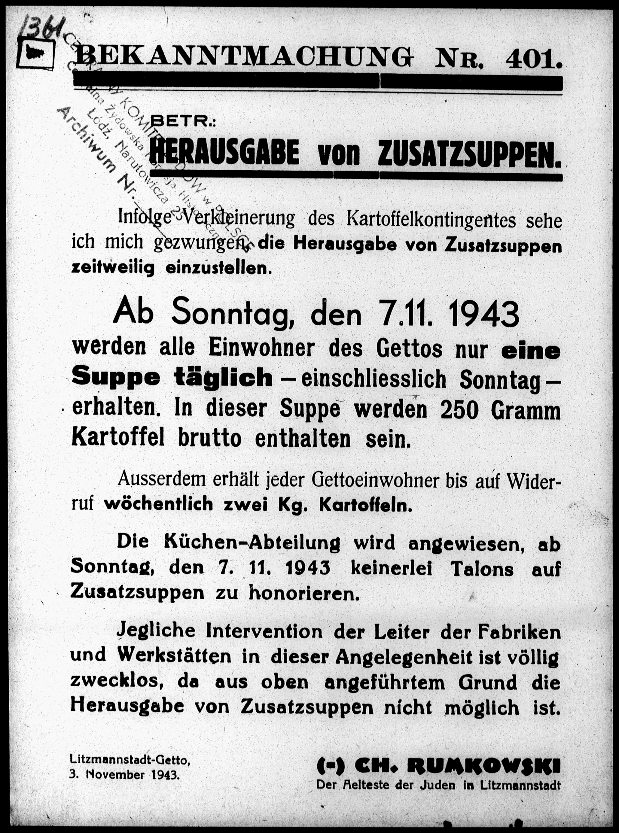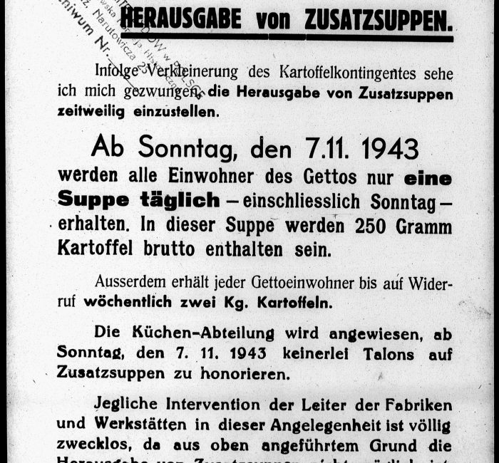 Od niedzieli, 7 listopada 1943 r., wszyscy mieszkańcy getta będą otrzymywać tylko jedną zupę dziennie, włącznie z niedzielą. Zupa będzie zawierać wsad kartoflany w ilosci 250 g brutto.