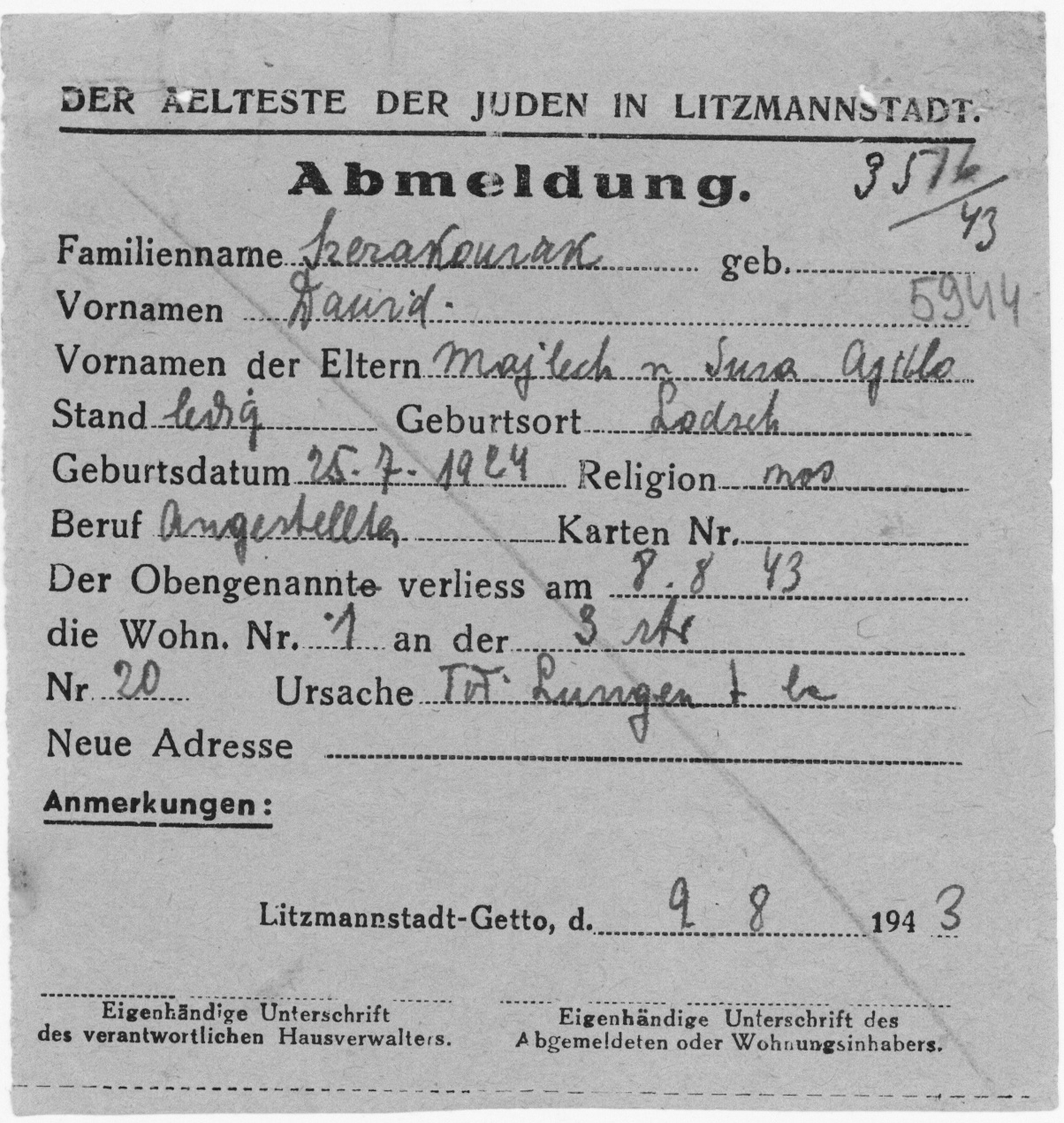 W czasie szpery do wysiedlenia skierowana została matka Dawida Sura Sierakowiak, którą po krótkim pobycie w punkcie zbornym (vide) zorganizowanym w gmachu Szpitala nr 1 (vide) przy ul. Łagiewnickiej 34/36 wywieziono do obozu w Chełmnie nad Nerem (vide) i tam zamordowano. Ojciec Dawida Majlech zmarł z wycieńczenia 6 marca 1943 r. Kilka miesięcy później Dawid wraz z siostrą przenieśli się 16 lipca 1943 r. na Wawelską 20 do ciotki Estery; Dawid mieszkał tam do śmierci. Zmarł na gruźlicę 8 sierpnia 1943 r. Jego siostra prawdopodobnie zginęła w obozie Auschwitz-Birkenau (vide), dokąd została deportowana podczas likwidacji getta (vide).