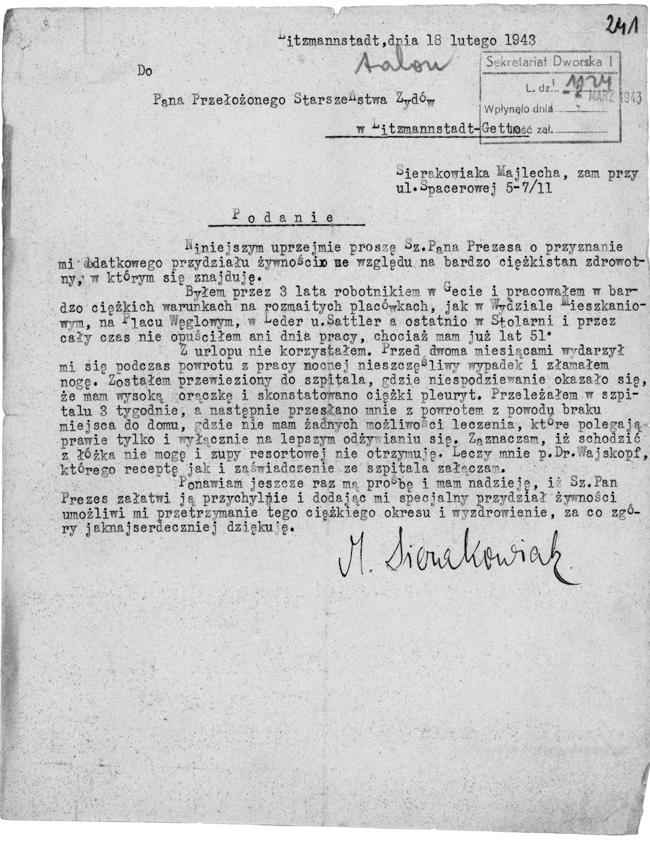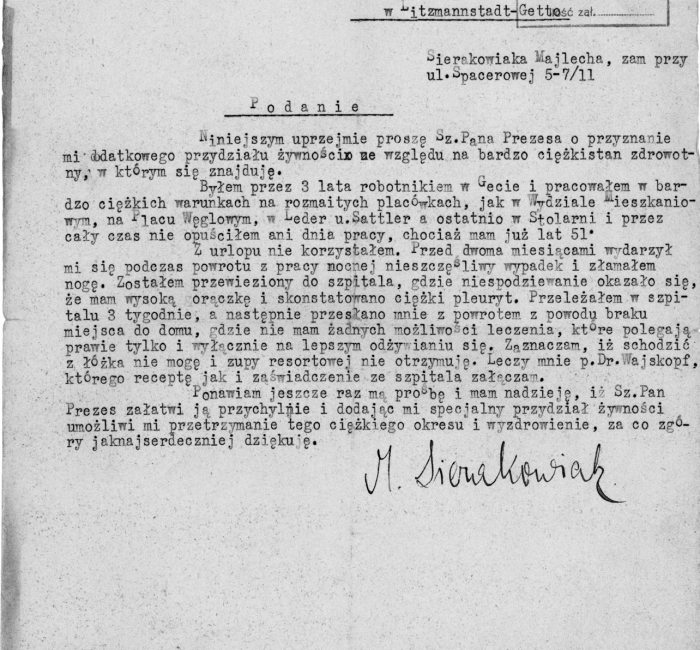 Od sierpnia 1942 r. pracował w Biurze Powołań (vide) mieszczącym się przy ul. Lutomierskiej 11. Zatrudnienie to również otrzymał dzięki protekcji – tym razem znajomego Lolka Milgroma, syna Wolfa Milgroma (vide), kierownika Biura. Tam też w pierwszych dniach września 1942 r. (vide Szpera) był świadkiem sporządzania list osób pracujących w celu uchronienia ich od deportacji. W 1943 r. udzielał korepetycji, m.in. w domu Radzynerów, dzięki czemu mógł liczyć na dodatkowy zarobek lub posiłek. Równolegle starał się o pracę w Oddziale Specjalnym Służby Porządkowej (vide), ale nie udało się mu jej otrzymać.