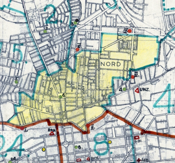 Na komisariat kierowano całą korespondencję z administracją żydowską oraz niemieckim Zarządem Getta (vide) dotyczącą granic getta, w tym raporty z użycia broni wobec osób zbliżających się do granic getta, a także wydawania przepustek umożliwiających wstęp na Bałucki Rynek (vide Bałucki Rynek) i na teren getta. Wszelkie pojazdy poruszające się po getcie musiały posiadać ostemplowane przez Schutzpolizei tablice rejestracyjne, a pojazdy wjeżdżające do getta z zewnątrz musiały otrzymać pozwolenie wjazdu.